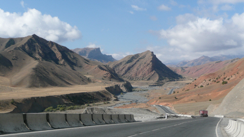 We bounced and lurched and at every bump Keith cursed and groaned in sympathy for the Pino. It was a long four hours, the only plus points of which were the continuing spectacular rocky scenery and the introduction of free-range camels to the herds of horses, sheep, goats and cows that we’ve enjoyed throughout Kyrgyzstan. Both of these would have been even better seen from the seat of the Pino rather than peering through the window of a truck.