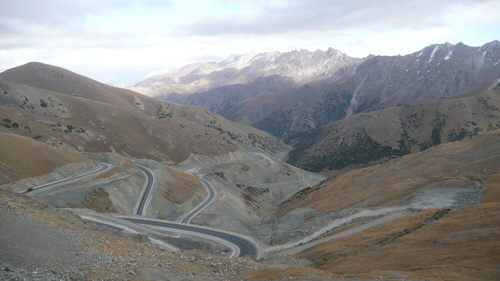 As expected, some serious altitude had to be gained before Sary Tash and the road rose steeply in a series of switchbacks which saw us slow to around 5kph and stop frequently to recover our breath in the hypoxic heights between 3000 and 3600m. Hour by hour the kilometres were slowly covered and at last we reached the top at 3615m. There was a lot of cloud cover on our side of the mountain and it was too cold to linger so we layered up, took a couple of quick photos, and then set off down what promised to be an exhilarating descent.