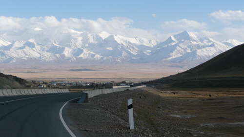 Sadly, that was the descending over with and we had to strip off several layers of clothes a few moments later as the road rounded a bend and began to climb again. A few small ups and downs later and we dropped into Nura, an odd little encampment of identical blue-roofed houses, much more in the Chinese style of town-building than the Kyrgyz. An easy handful of kilometres after Nura was Irkeshtam, with a long, long, queue of trucks snaking along the road for over a kilometre, waiting for the border to open the next morning after the week-long Chinese holiday. Just before the lorry queue was a small encampment of other cyclists who the French guys were expecting to see there having made tentative arrangements earlier in their respective Central Asian journeys. We agreed to join them later after checking out the cafe in Irkeshtam.