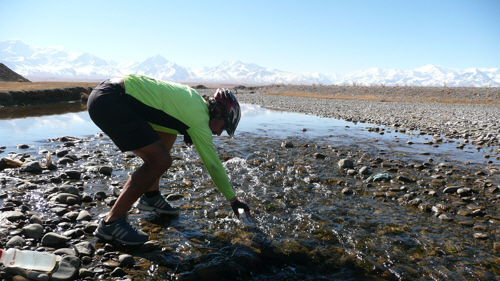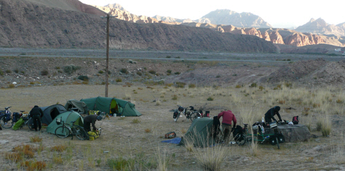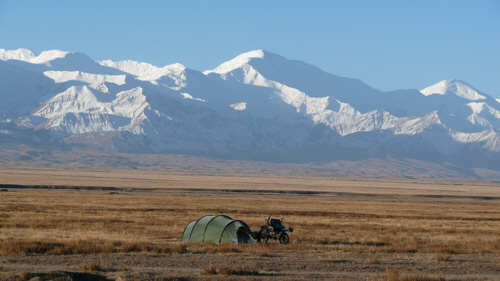 After picking up some biscuits and yoghurts from the scant provisions on offer in Sary Tash’s shops we rode out of town towards the breathtakingly beautiful white peaks stretched before us. There were still a couple of hours of daylight and 70km and another high pass to cover before reaching Irkeshtam, which was our goal for the following day, but instead of using those two hours to get some more kilometres done we decided to camp just outside Sary Tash and soak up the spectacular view for at least as long as we could bear in the freezing wind.