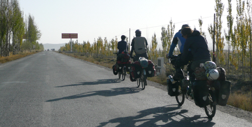 Back on the road the tyre lasted about 3 minutes before going down again, whereupon we unpacked the trailer, shoved a new tube in, repacked the trailer and were back on the road in 10 mins flat, but now almost half an hour behind the slowest of the other riders. We didn’t see much of China after that as it became a head-down ‘time-trial’ style effort to catch up before reaching Kashgar. Thankfully the road was a slight downhill and we tanked along at 40kph overtaking scooters and weaving scarily around dawdling pedestrians in the towns we sped through.