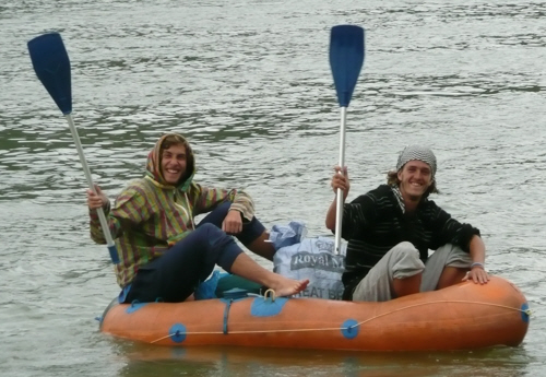 I hadn’t realised before, but Hungary is famous for its hot spas, and not just in Budapest. We treated ourselves to a night in a campsite adjacent to a spa and I dumped the clothes I hadn’t been able to wash in Bratislava into the washing machine, and then went for a swim with Keith followed by a nice soak in the outdoor hot pool. Unfortunately our spa-lounging was cut short by the appearance of a rainstorm…which got heavier and heavier and turned into a stupendous thunder and lightning display. We hastily dried ourselves and went to rescue our washing…and in the absence of either a tumble dryer or sunshine we bundled our clean but wet clothes into the tent and there we remained until 11 the following morning when we were forced out by the discovery that we’d actually pitched in a slight hollow and the tent was starting to float…..doh! We de-camped to the kitchen area where we spread out our sodden belongings and waited for the rain to ease…which it finally did just after lunch and we eventually got ourselves dried out, repacked and on the road by around 3.45pm. We didn’t get many miles done that day and, as the evening was dry, we decided to take advantage of a nice spot down on the bank of the Danube and eat our dinner watching a beautiful sunset. As we were checking out the potential wild campsite we met a couple of guys who were just packing up their own camp, and I’m really sorry they left us as they were great fun and for days to come we would grin just thinking of them. I guess they were in their early 20s, a Frenchman and a German who’d met in Israel, recognised they were kindred ‘live-for-the-moment’ spirits and decided to cycle back to Europe. They got as far as Egypt (we’ve no idea why they thought Egypt was on route between Israel & Europe – probably similar to Keith’s idea of going from London to the Black Sea via Scotland…) then ditched the bikes and I think then hitched back to Europe and were now making their way from Vienna to Budapest and then on to a rave near Lake Balaton. Since they’d had 10 spare days before they needed to be in Budapest they’d hit upon the splendid idea of paddling down that section of the Danube. Great plan, no? So, they’d bought a 2nd hand inflatable dinghy off Ebay for €15, bundled their scant (and now rather damp) belongings into a couple of rucksacks and a Royal Mail post bag (!), and set off. We laughed in disbelief at their tiny dinghy (they had to sit on their belongings, which filled the entire bottom of the dinghy, and there was only space for one of them to paddle at a time) and they proudly showed us its safety features, which seemed to consist solely of a built-in pump for easy re-inflation, which worked perfectly if one of them pinched closed the holes in the bellows whilst the other one pumped. They were probably the two most hilariously optimistic and friendly people we’ve ever met. Armed with wide grins and brimming with enthusiasm they left us with the feeling that absolutely anything was possible. I’d love to know what crazy adventure they come up with next. Bon voyage guys!