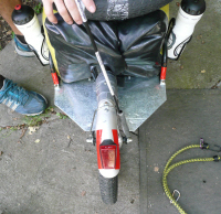 - First tweak was to construct a new tube for the warning flag-pole, so that the flag could be mounted as far back as possible to allow space for our solar-panel. The sturdy metal support for the back of the mud-guard (fender in manufacturer’s language) proved an excellent place to tape on a carefully sculpted tube (made from a plastic beer-bottle & duck-tape).