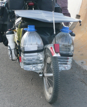 - Carrying enough water on our tandem, in the hot summer sun, is often a problem. Last year, we tried just strapping big bottles of water on, but they fell off more than once. So this year, we’ve constructed two shelves right beside the trailer wheel, where we can strap on one or two large 5 or 6 litre water bottles, one on either side. By carrying the load so far back, it keeps as much of the weight as possible off the tandem back wheel (tandem’s weakest point) and doesn’t affect the trailer handling at all. The shelves were made from some (probably) 1mm thick sheet metal (possibly galvanised tin) that we found on the roadside just before getting to Moscow, and some tools borrowed from our hosts during our stay there. The extra capacity has already proved very useful as in some of the parts of Russia that we’ve already covered, we can travel for a full day without passing a shop and we are consuming about 6 to 8 litres of water each day.