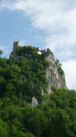 We finally escaped Donaueschingen on Thursday 16th June and rode across a huge saucer-like plateau to where the Danube disappears down a karst sink. Now you see it, now you don’t. At least, that’s what we’d hoped it would be like. Unfortunately the cycle-route doesn’t run close enough to the river bank to see the actual point of disappearance. We pedalled back up the dry river-bed for a while but soon gave up on that as it was very rocky and also about to rain. Rejoining the river further down we entered a dramatic gorge through the Swabian Alb with soaring cliffs and precariously perched castles.