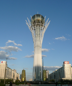 Gleaming bronze, gold and green skyscrapers glittered and shimmered in the evening sun. The imposing block-shapes of fortress-like, Soviet-inspired buildings sat in sharp contrast with the futuristic curves of the Norman Foster designed shopping centre. Skyscrapers leaned quirkily like books on a shelf. Golden minarets nestled in a strange harmony amongst the mish-mash of classic colonnades, sleekly curved glass expanses and pagoda-style roofs. The city is barely twenty years old, and the newness lends it an energy, a feeling that anything is possible, and this energy and the diverse cultural heritage of its inhabitants are reflected in the extraordinary mix of architectural influences exhibited by its buildings.