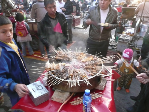 That evening, after the usual round of washing clothes and catching up on emails that seems to take up the bulk of any hotel stop for a cycle tourist, we went for a stroll around the sights of Zhangye in the bitter cold and then to a small restaurant for dinner.