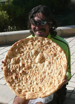 Ten kilometres later, when a truck slowed alongside to get a better look at us, Keith didn’t hesitate. Out went the thumb and on went the hopeful puppy-dog face. And it worked! The truck stopped and so did the one which was in convoy behind it. Within a short while our tandem and trailer were strapped securely on top of the cargo of the first truck, our front bags were in its storage compartment and our rear panniers and solar panel were in the storage compartment of the second truck. 400km disappeared in a matter of hours and our lovely driver and his wife fed us apples and pastries on the way. We offered our driver some money, but he wouldn’t accept it, preferring an English fiver as a memento.