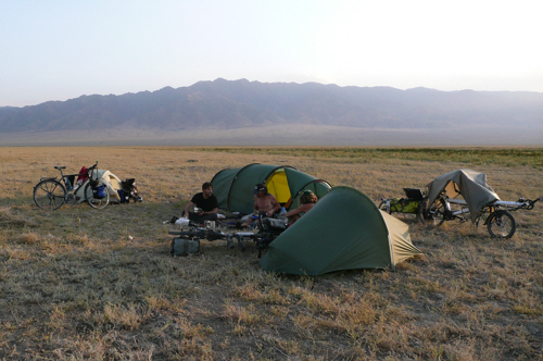 We bounced and lurched and at every bump Keith cursed and groaned in sympathy for the Pino. It was a long four hours, the only plus points of which were the continuing spectacular rocky scenery and the introduction of free-range camels to the herds of horses, sheep, goats and cows that we’ve enjoyed throughout Kyrgyzstan. Both of these would have been even better seen from the seat of the Pino rather than peering through the window of a truck.
