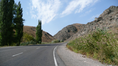 At the top we found the French trio waiting for us. It was too cold to stop for a proper lunch break so after layering up with clothes and gobbling down a couple of sugared buns we set off on the descent. We’ve enjoyed some absolutely brilliant descents in Kyrgyzstan but this one was the mother of them all. The tarmac was not quite as good as on other roads and Keith had to concentrate on avoiding the odd pot-hole that sucked at our spinning wheels, but the road was wide, there was very little traffic, visibility was excellent, we had a tailwind and the weight of us, the bike and our luggage; all the ingredients were there for a fast and fabulous descent.