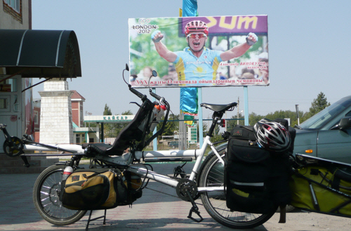 Back on the road the tyre lasted about 3 minutes before going down again, whereupon we unpacked the trailer, shoved a new tube in, repacked the trailer and were back on the road in 10 mins flat, but now almost half an hour behind the slowest of the other riders. We didn’t see much of China after that as it became a head-down ‘time-trial’ style effort to catch up before reaching Kashgar. Thankfully the road was a slight downhill and we tanked along at 40kph overtaking scooters and weaving scarily around dawdling pedestrians in the towns we sped through.