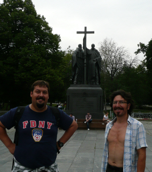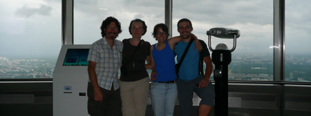 Keith alarming Tas with his head for heights after Tas bet he couldn’t stand on the top (there’s a significant sheer drop just next to his left foot). Almaty is just visible down in the valley.